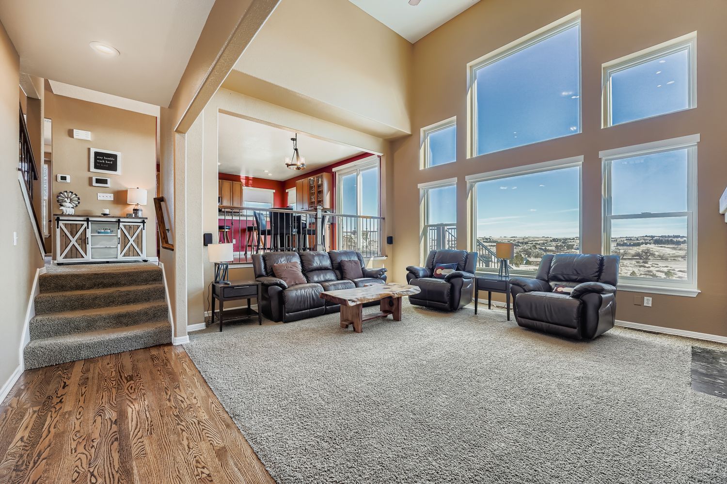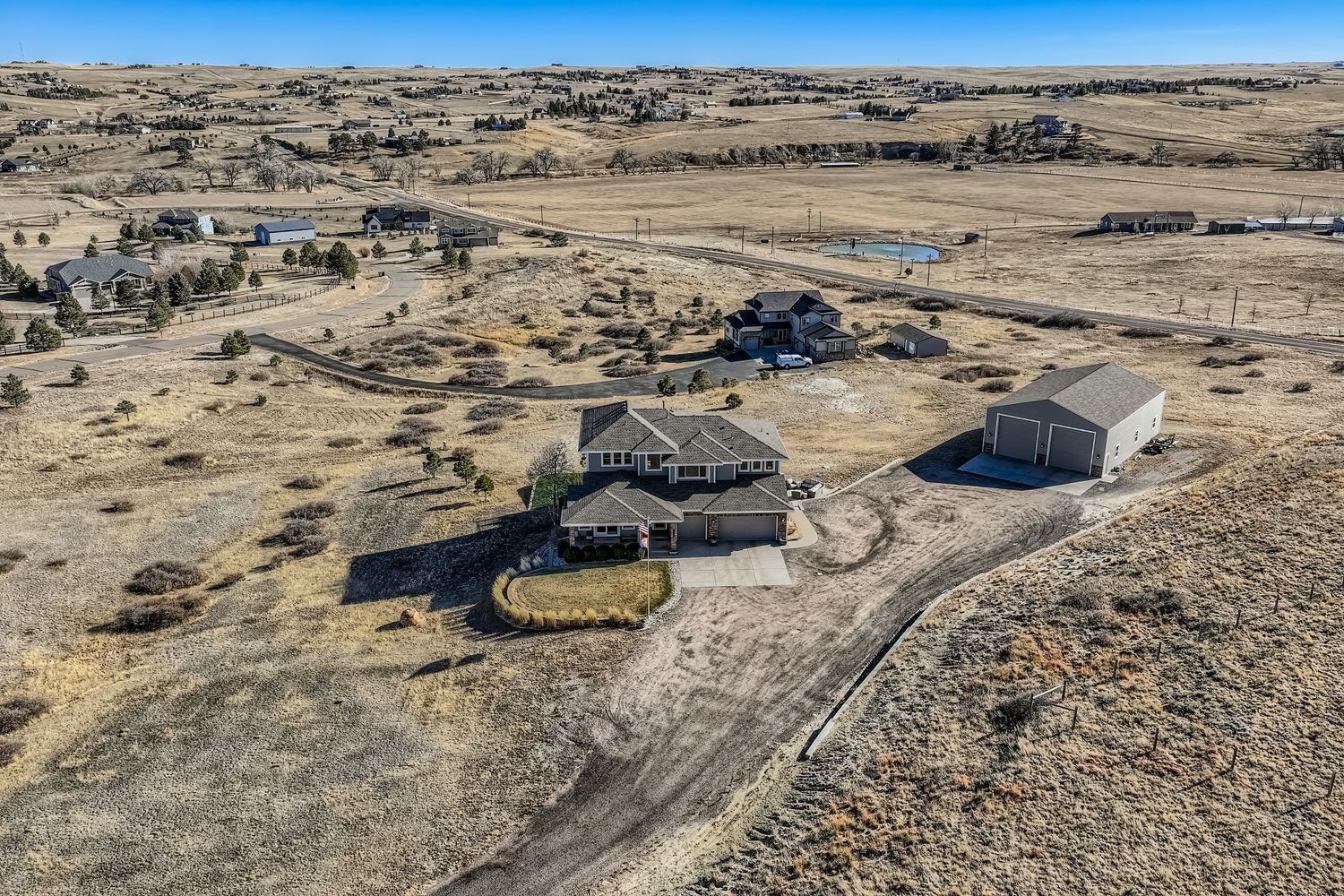 Perfectly positioned on 5 acres in the sought after Elkhorn Ranch community, this exceptional property offers an ideal blend of privacy, space, and convenience with easy access to E470. The kitchen is designed for both everyday living and entertaining, featuring a four burner gas cooktop, double ovens, center island with seating, electric blinds, and peaceful views from the kitchen windows. The family room features soaring ceilings, a wall of windows, and a cozy gas fireplace, filling the space with natural light and bringing the Colorado landscape right inside. A main floor bedroom offers flexible use and is ideal for a home office or guest space. Upstairs, the spacious primary suite features a sitting area with peaceful views and a beautifully remodeled ensuite bathroom with soaking tub, multi head shower, and dual walk-in closets. The primary bedroom also features electric blinds. The partially finished walkout basement provides excellent flexibility, with a… Read Morededicated flex room currently used as a gym and additional space ready to customize to your needs. Outside, enjoy wide open skies from the deck and plenty of room to spread out on the land. The property includes an attached three car garage plus an impressive detached 60 x 40 workshop, ideal for RVs, boats, toys, or hobby use. Recent upgrades include new windows and blinds throughout, updated light fixtures, a remodeled primary bathroom, new deck and patio, both air conditioning units replaced in 2021, new roof and exterior paint completed in 2023, a new water heater in 2025, basement furnace replaced in 2023, and a private putting green. The home has been pre-inspected and an HOA report is being provided.Read Less